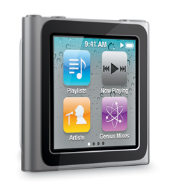 Características | Cambia la forma, tamaño y volumen respecto al iPod nano 5G, sustituyendo la pantalla anterior por una capacitiva de 1,54 pulgadas con 240x240 píxeles. Se añaden funciones de accesibilidad. Pierde la rueda táctil y la cámara de video. Se ofrece en 7 diferentes colores: plata, gris, azul, verde, amarillo, rosa y rojo, este ultimo es perteneciente a la familia Product Red contra el Sida en África y solo se puede adquirir a través de Apple Store. Aumenta su precio con respecto a los anteriores modelos. |